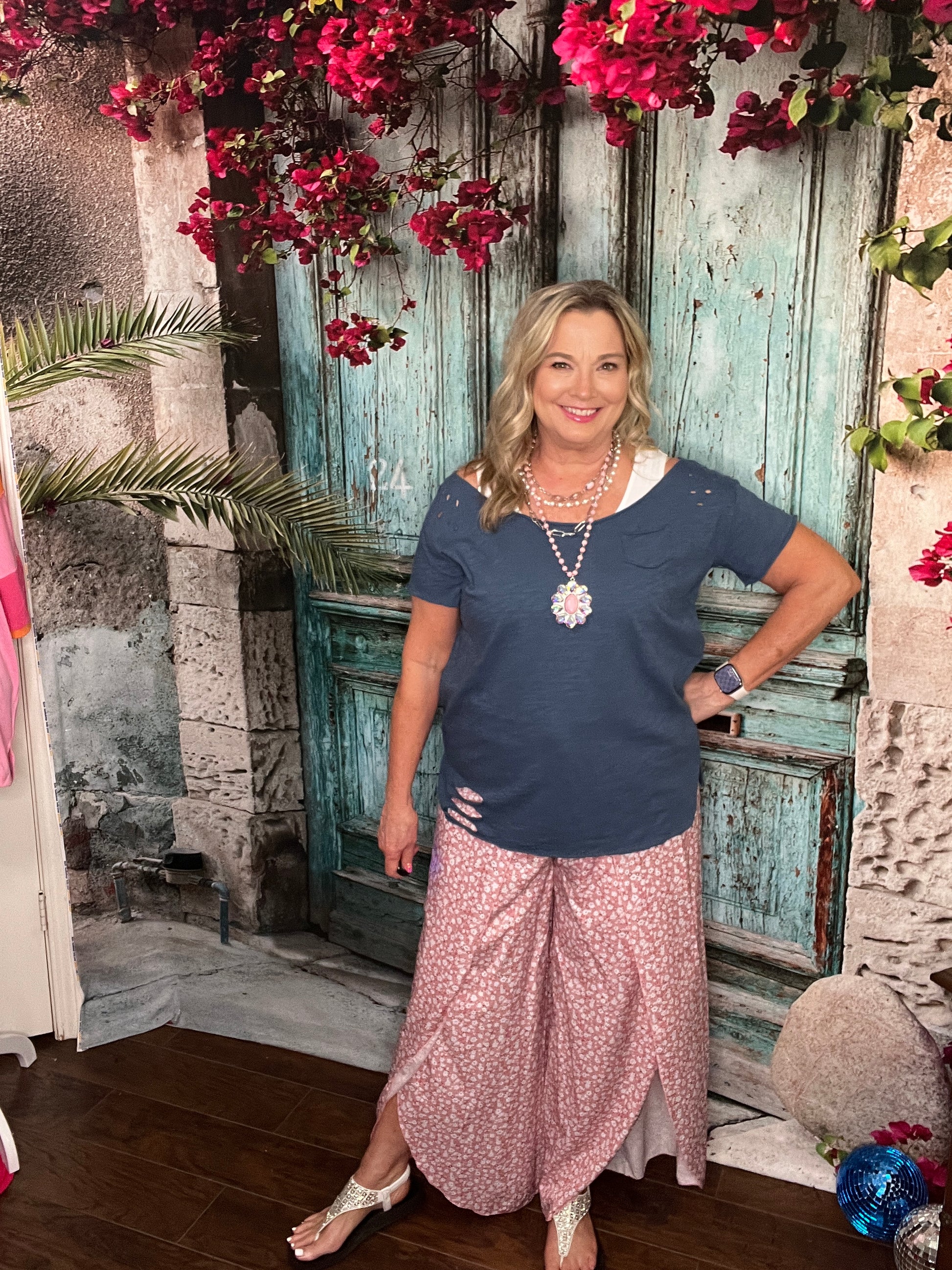Float through your day in effortless style with the Blossom Breeze Palazzo Pants! ๐ธโจ These wide-leg beauties have the dreamy flow of a skirt with the comfort of pants, thanks to the wrap-around slit detail that moves with you. The smocked high waist ensures a flattering and comfy fit, while the soft pink fabric with a delicate petite floral design adds a touch of romantic charm. Perfect for brunch dates, spring strolls, or dressing up with your favorite heels!