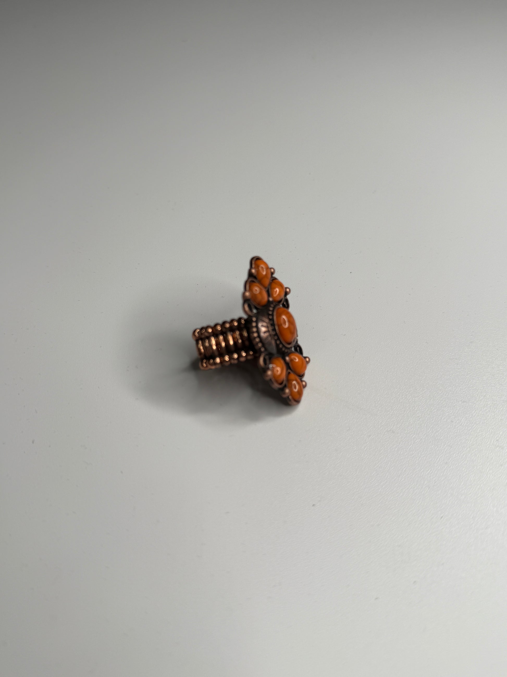 Turn every look into a statement with the Desert Bloom Ring! 🌵✨ Designed with a comfortable stretch band to fit all sizes, this copper-finished beauty brings western charm with a touch of vibrant color. Its oblong, squash blossom–inspired design is adorned with colored stones that pop against the warm copper tones, making it a true standout piece.