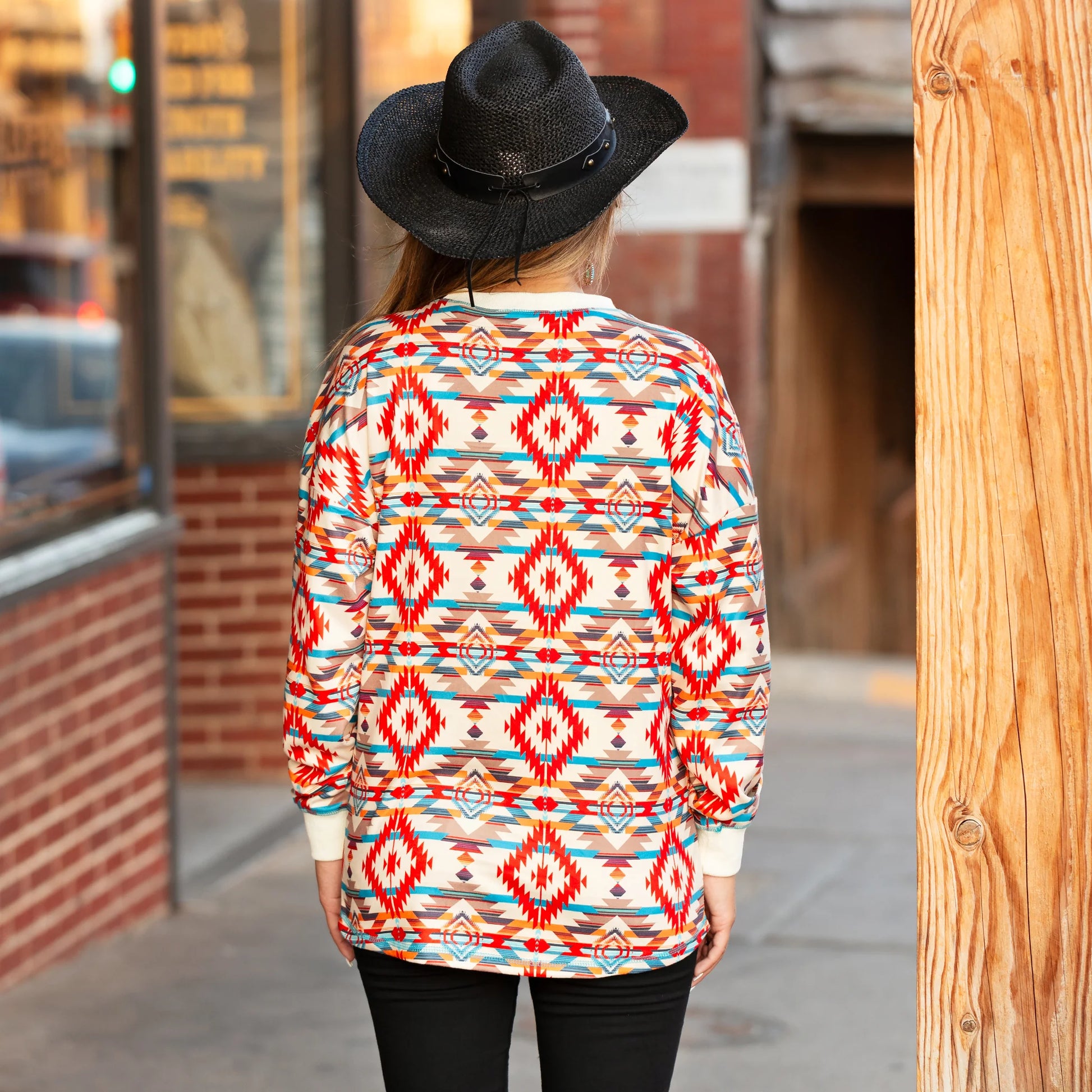 Step into southwestern charm with the Desert Dreamer Top! This stunning long-sleeve top features a vibrant Aztec design in warm tones of orange, cream, and beige, perfect for adding a touch of flair to your everyday look. The soft, breathable fabric ensures all-day comfort, while the eye-catching pattern makes it easy to stand out. Whether paired with jeans, boots, or layered with a jacket, this top is a versatile must-have for your wardrobe.