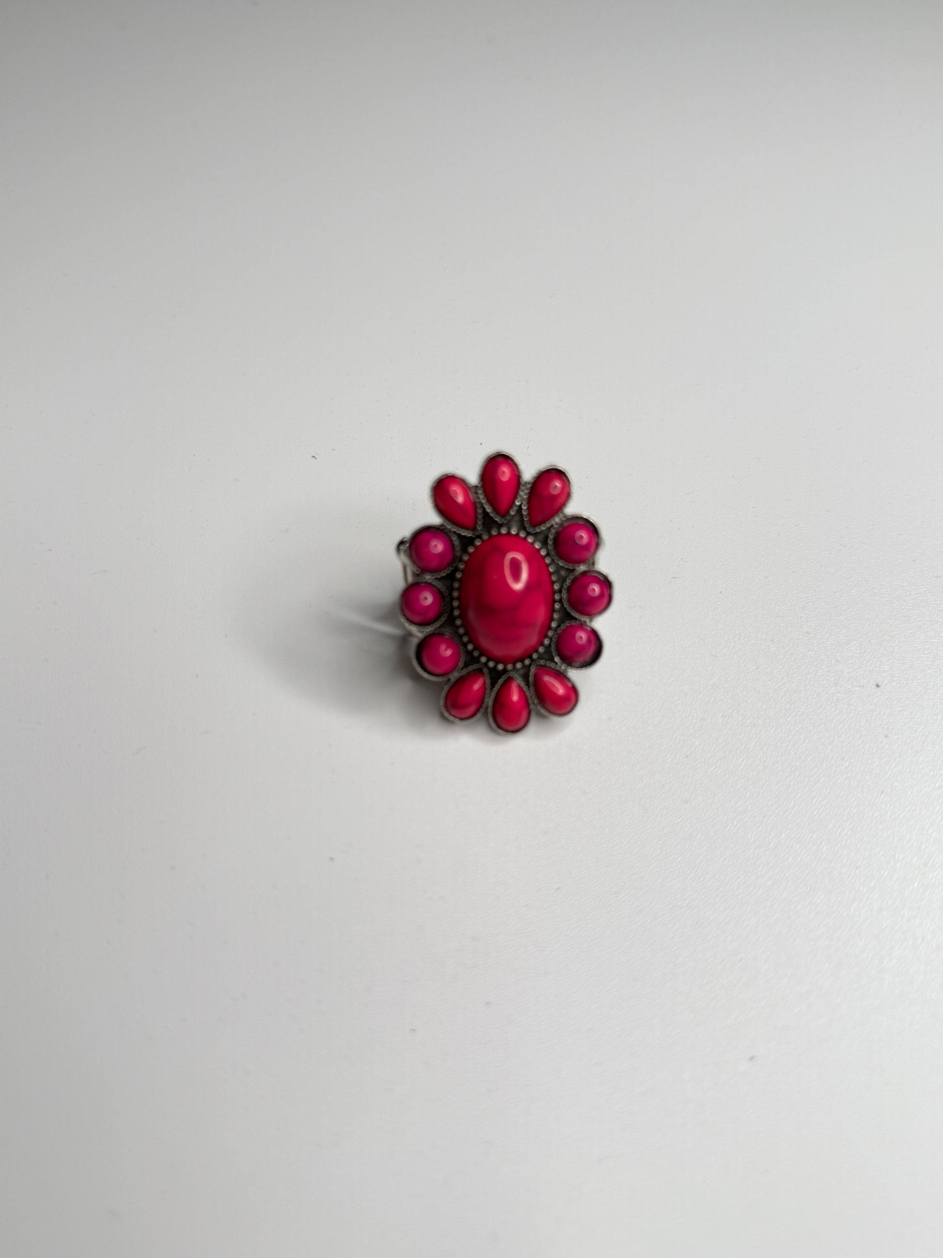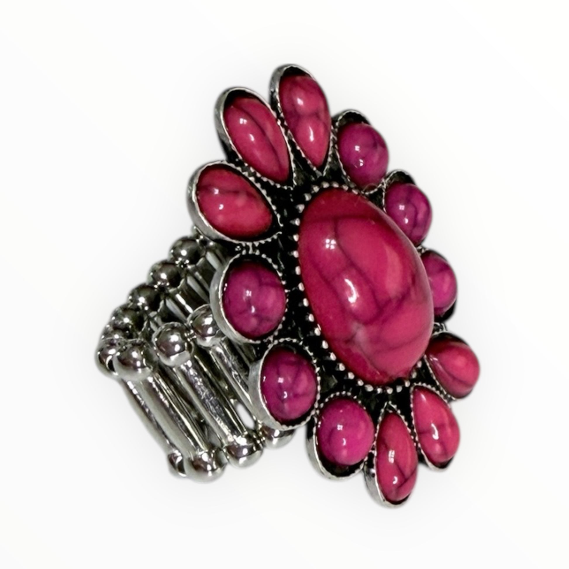 Make a bold statement with the Fuchsia Bloom Ring! This stunning squash blossom-inspired piece features radiant hot pink stones set in a silver-tone design that shines with western flair. The stretch band ensures a comfortable, flexible fit—perfect for any finger size.