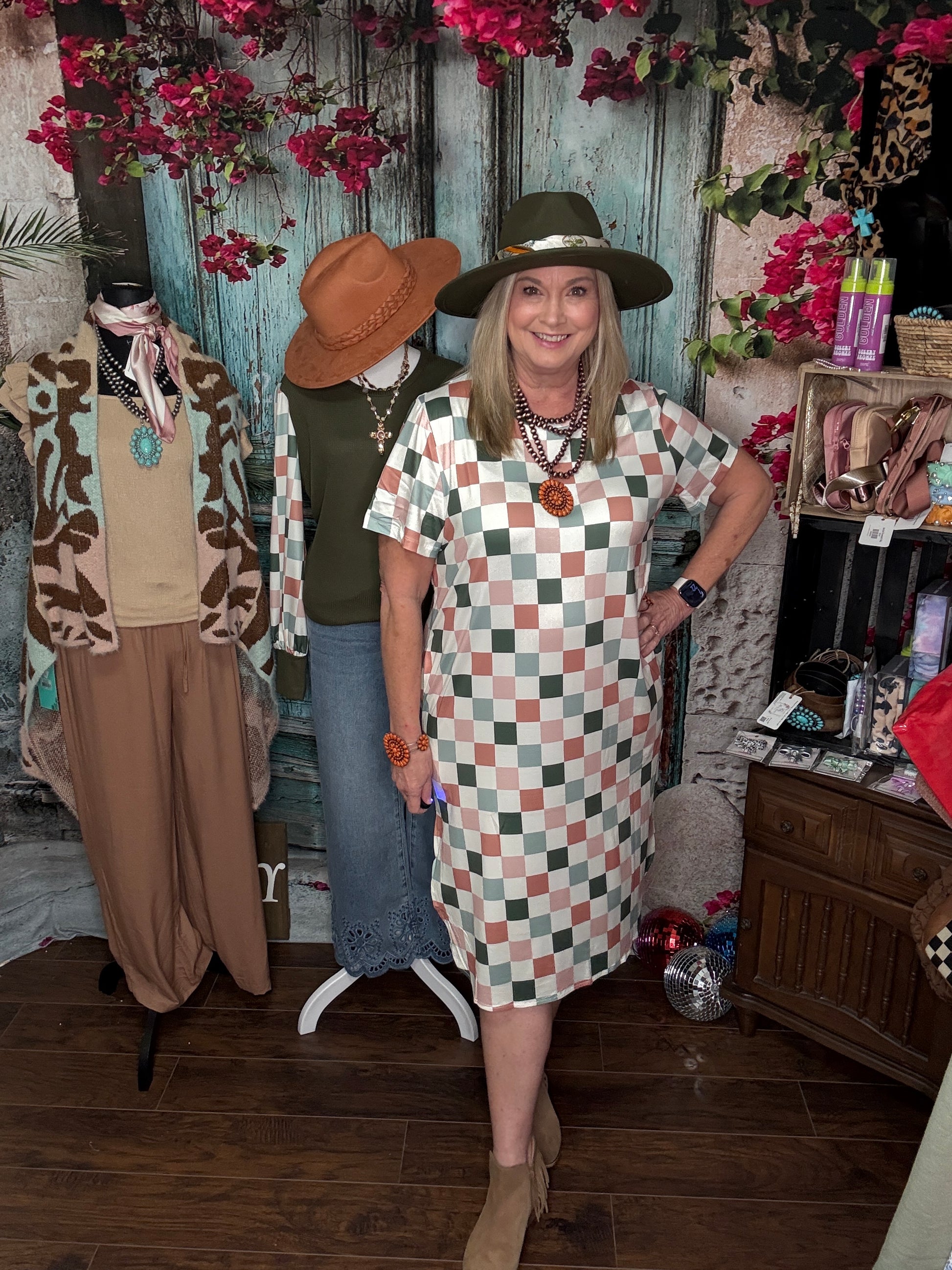 Fresh, timeless, and effortlessly chic — the Harvest Checks Dress brings playful charm to your wardrobe! This cream shift dress features a straight silhouette with the sweetest surprise — side pockets (because every girl loves a dress with pockets!). Its checkered design in olive green, soft orange, pinks, and pale blue adds a soft pop of color that feels perfect for the season.