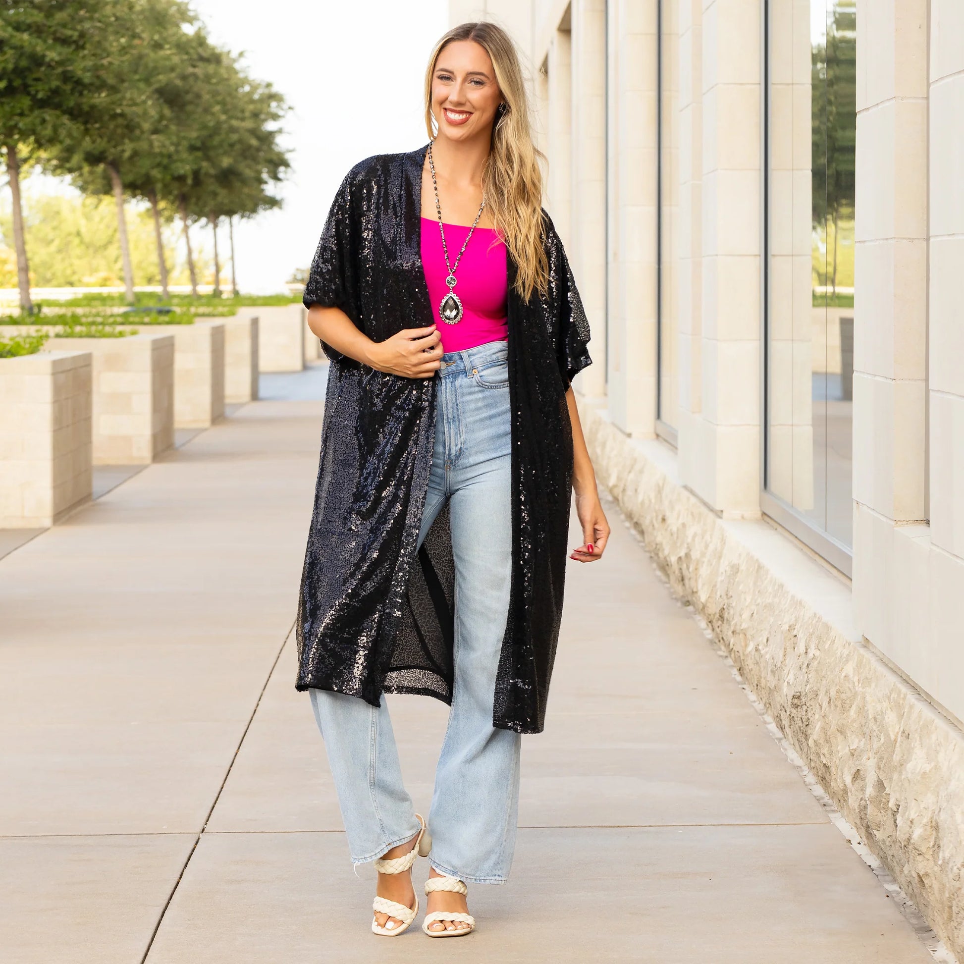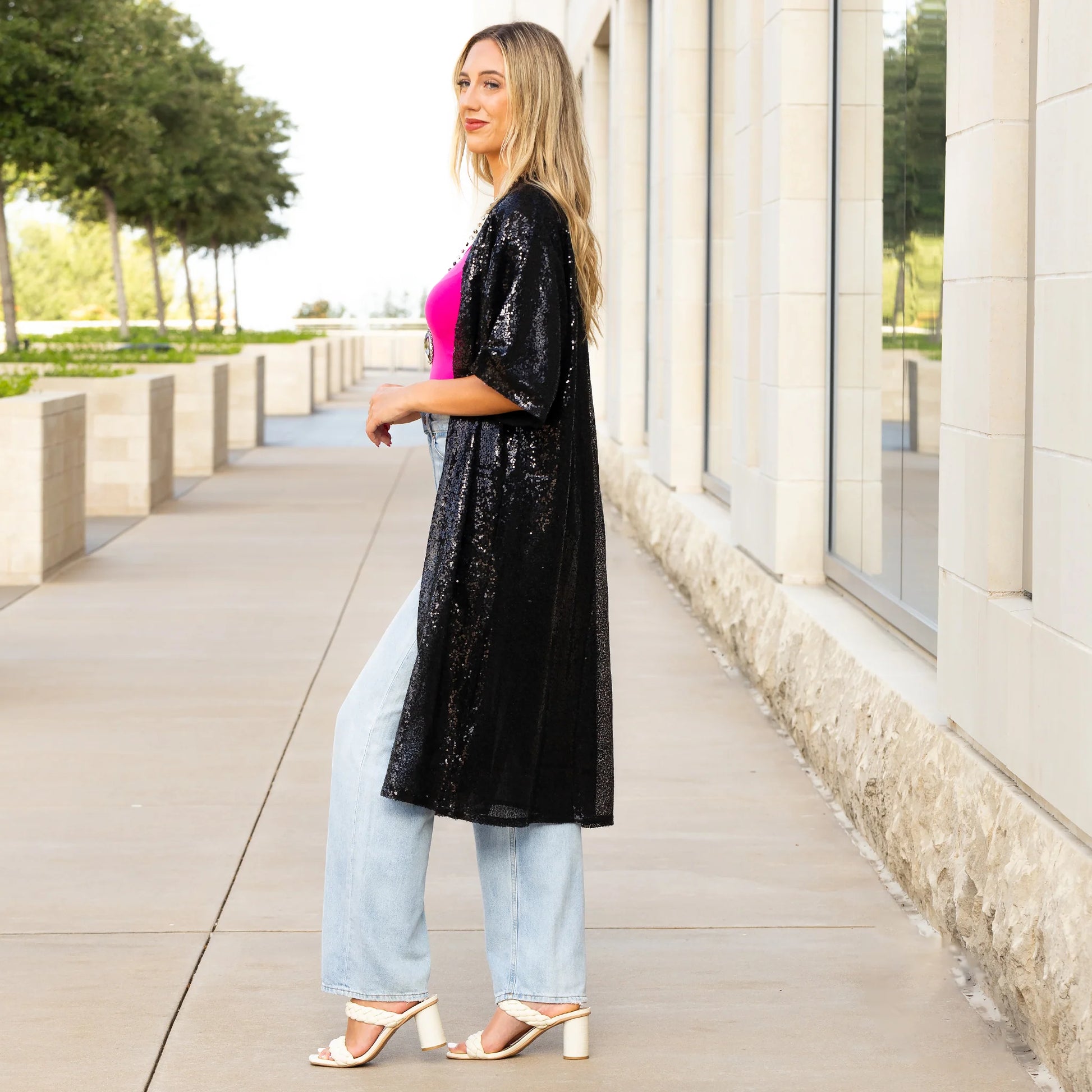 Turn heads and add instant festive flair with the Midnight Spark Duster! This stunning sequin duster is crafted from 100% polyester and designed to shimmer from every angle, making it the perfect finishing touch for holiday parties, New Year’s Eve celebrations, or any special night out.