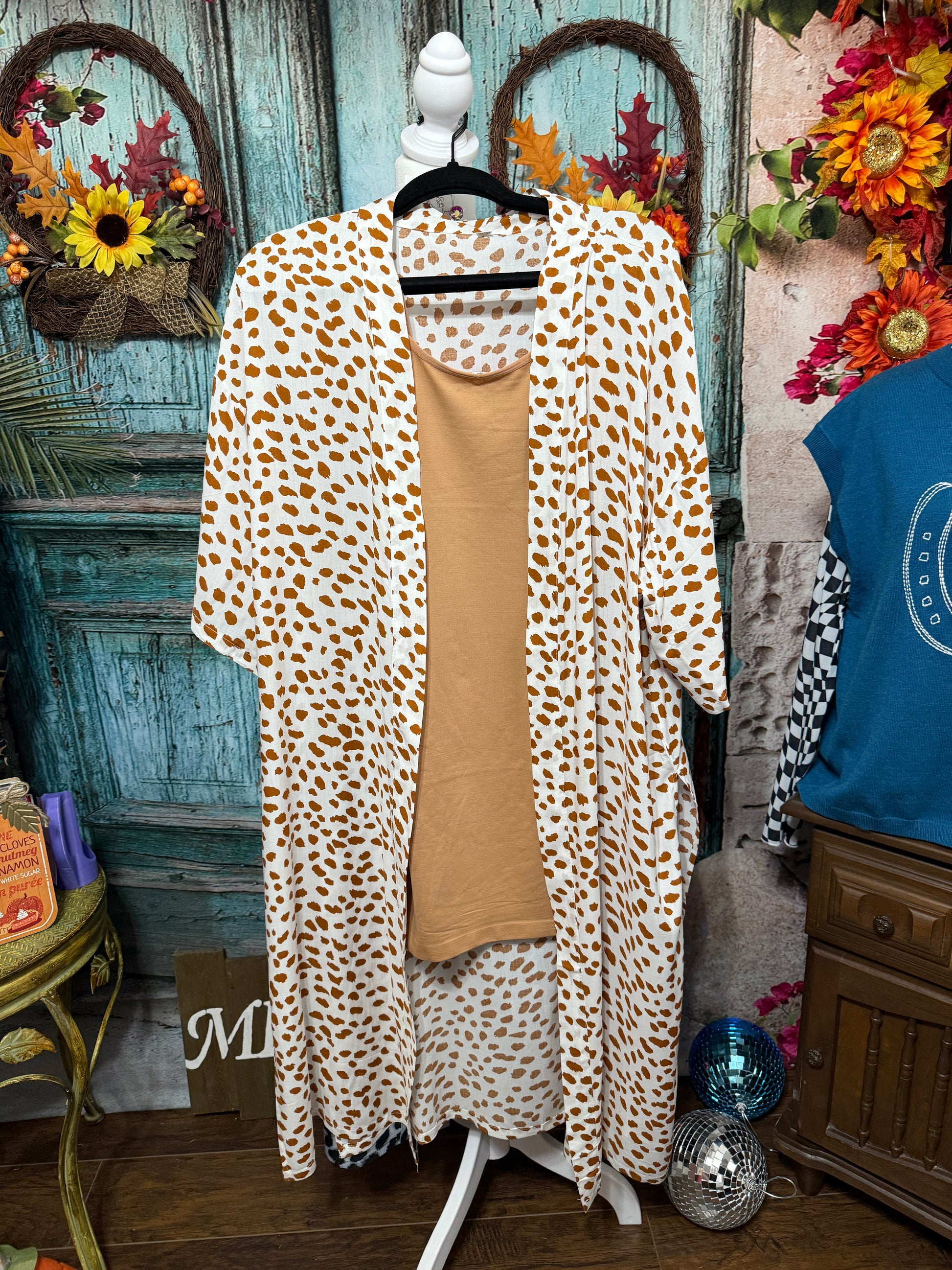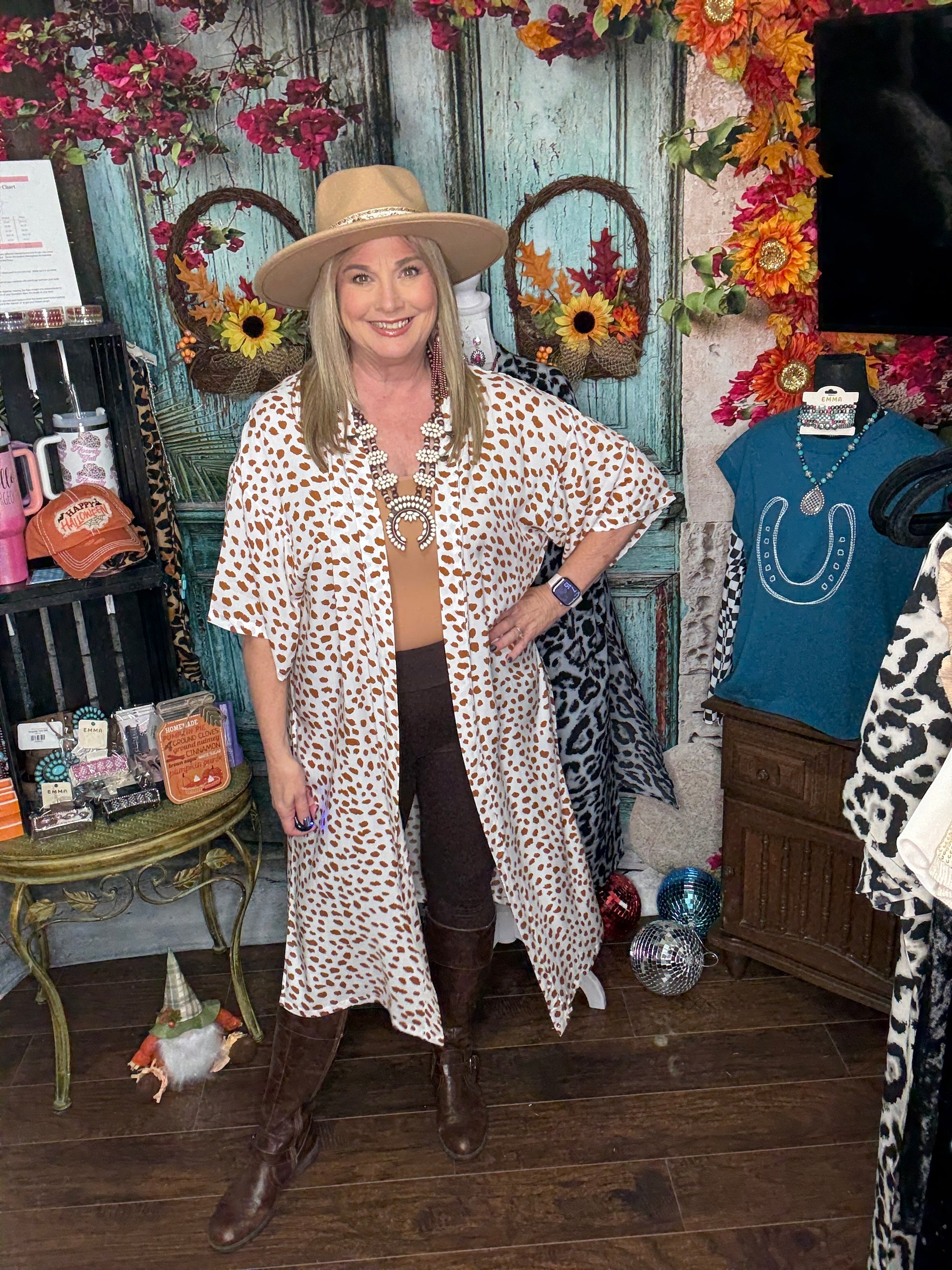Wildly chic and effortlessly classy — The Savannah Spot Duster is your go-to piece for layering with style this season! Featuring a soft white base with a bold brown animal spot print, this lightweight duster adds instant flair to any outfit.